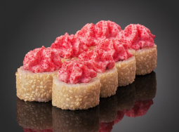 Ролл с снежным крабом, сливочным сыром и соусом лава с икрой масаго в обсыпке из кунжута