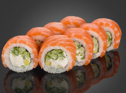 Ролл со сливочным сыром обернутый в нежнейший лосось с шапочкой из креветок и авокадо
