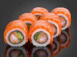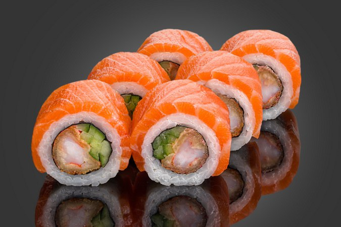Ролл с лососем, креветкой темпура, соусом спайси и огуцом