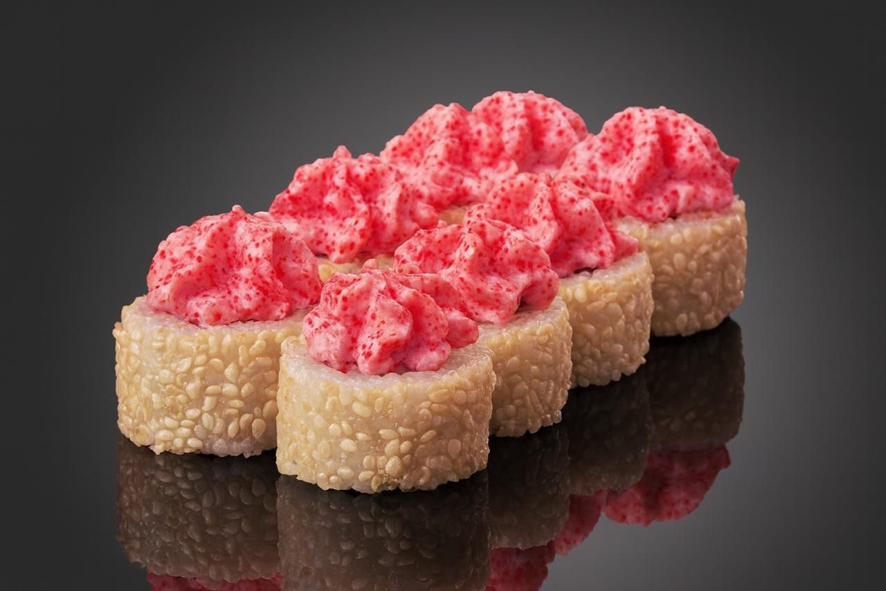 Ролл с снежным крабом, сливочным сыром и соусом лава с икрой масаго в обсыпке из кунжута