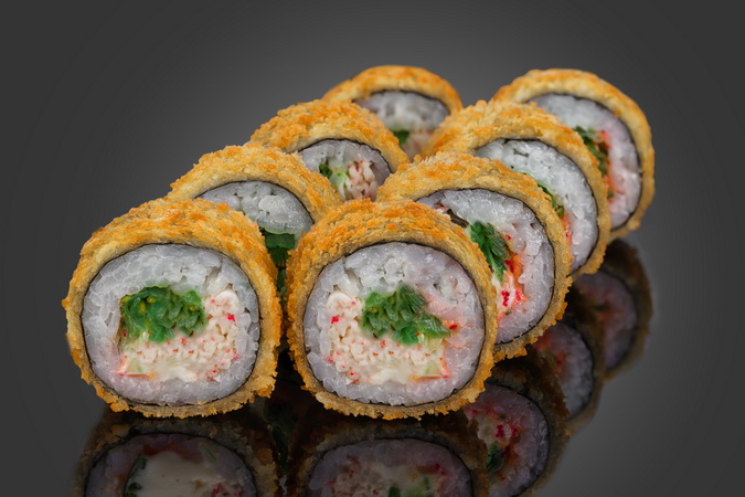 Криспи ролл с снежным крабом, соусом спайси, чукой и сливочным сыром в кляре темпура