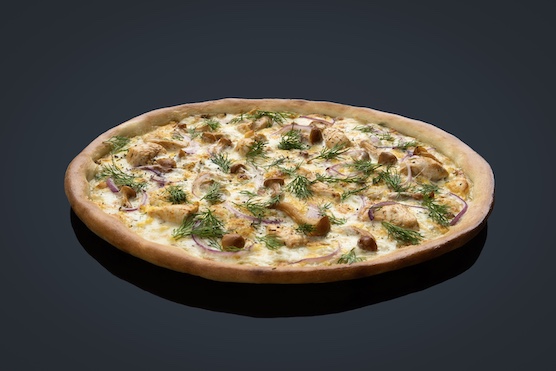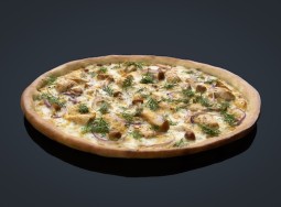 Пицца с белым соусом, маринованной курицей, опятами, красным луком и укропом