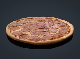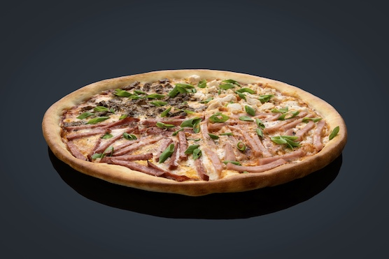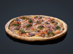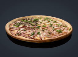 Пицца с соусом Пронто, ветчиной, маринованной говядиной, салями, копчёной курицей, зелёным луком и смесью сыров