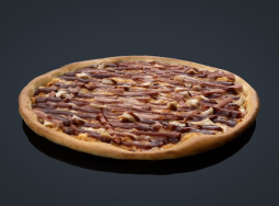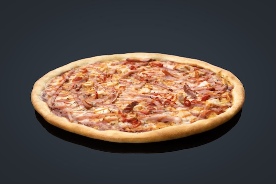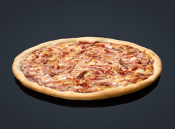 Пицца с соусом BBQ, салями, ветчиной, маринованной курицей, смесью сыров и чесночным маслом