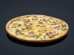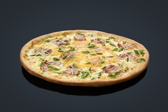 Пицца на сливочной основе с беконом, яичным желтком, пармезаном и зеленым луком