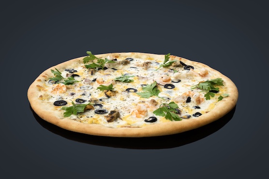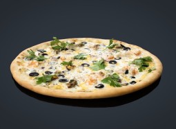 Пицца с белым соусом, морским коктейлем, креветками и маслинами