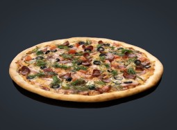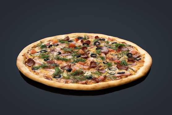 Пицца с соусом Пронто, охотничьими колбасками, ветчиной, маринованным огурцом, помидорами и маслинами