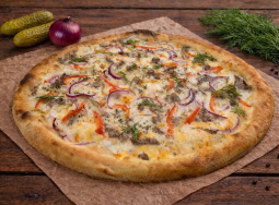 Пицца с белым соусом, отварной маринованной говядиной, огурцом, болгарским перцем, сыром Моцарелла и красным луком