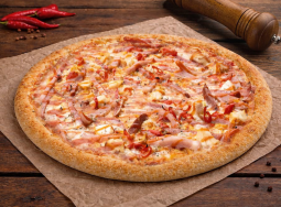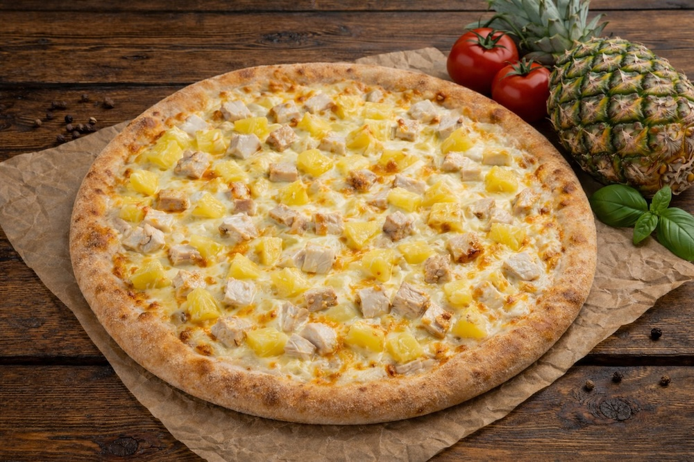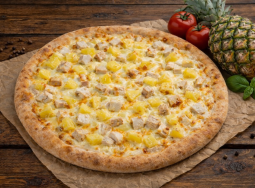 Пицца на тонком тесте с копчёной курицей, кусочками ананаса,фирменным томатным соусом и сыром Моцарелла