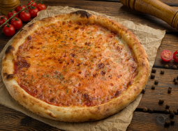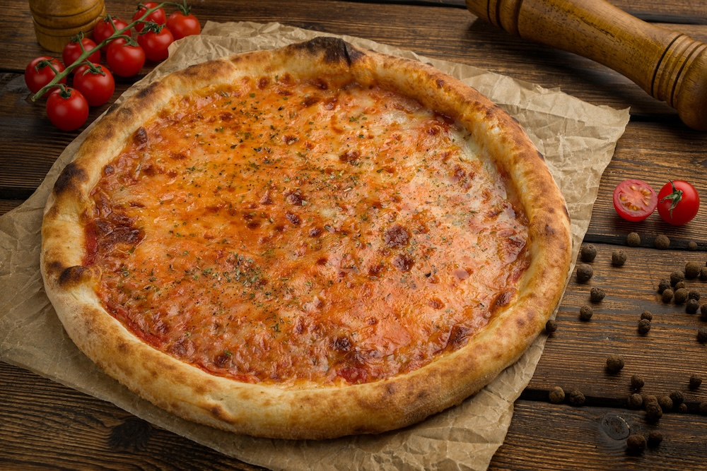 Классическая итальянская пицца на тонком тесте с сыром Моцарелла и фирменным томатным соусом