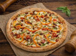 Классическая итальянская пицца на тонком тесте с шампиньонами, красным луком, запеченным болгарским перцем, маслинами, колбасой пепперони, свино-говяжьим фаршем и сыром Моцарелла