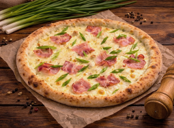Классическая итальянская пицца на тонком тесте с беконом, сырами Пармезан и Моцарелла , соусом Альфредо, украшенная зеленым луком