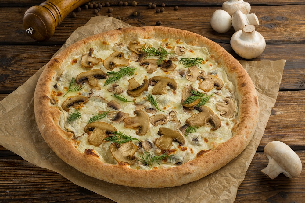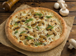 Пицца с Белым соусом, сыром Моцарелла , шампиньонами и укропом