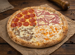 Пицца , разделённая на четыре части с четырьмя различными начинками : колбаса Пепперони, фарш свино-говяжий, курица, ветчина и сыром Моцарелла