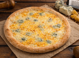 Классическая итальянская пицца на тонком тесте со смесью сыров -Гауда, Эдам, Моцарелла, Пармезан, Горгонзола и фирменным мускатным соусом