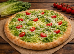 Пицца с белым соусом , курицей, помидорами черри, салатом Романо и сыром Пармезан