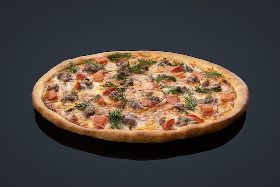Пицца с соусом Пронто, свино-говяжьим фаршем, красным луком, помидорами и укропом на чесночном тесте