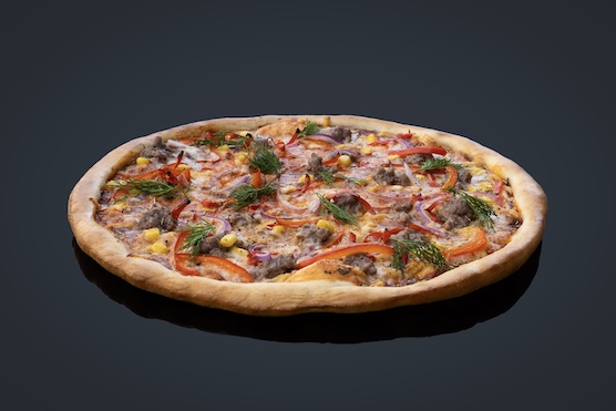 Острая пицца с фаршем, болгарским перцем, кукурузой, красным луком и чили