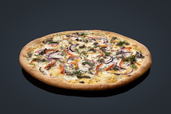 Пицца с белым соусом, маринованной говядиной, огурцом, болгарским перцем и красным луком