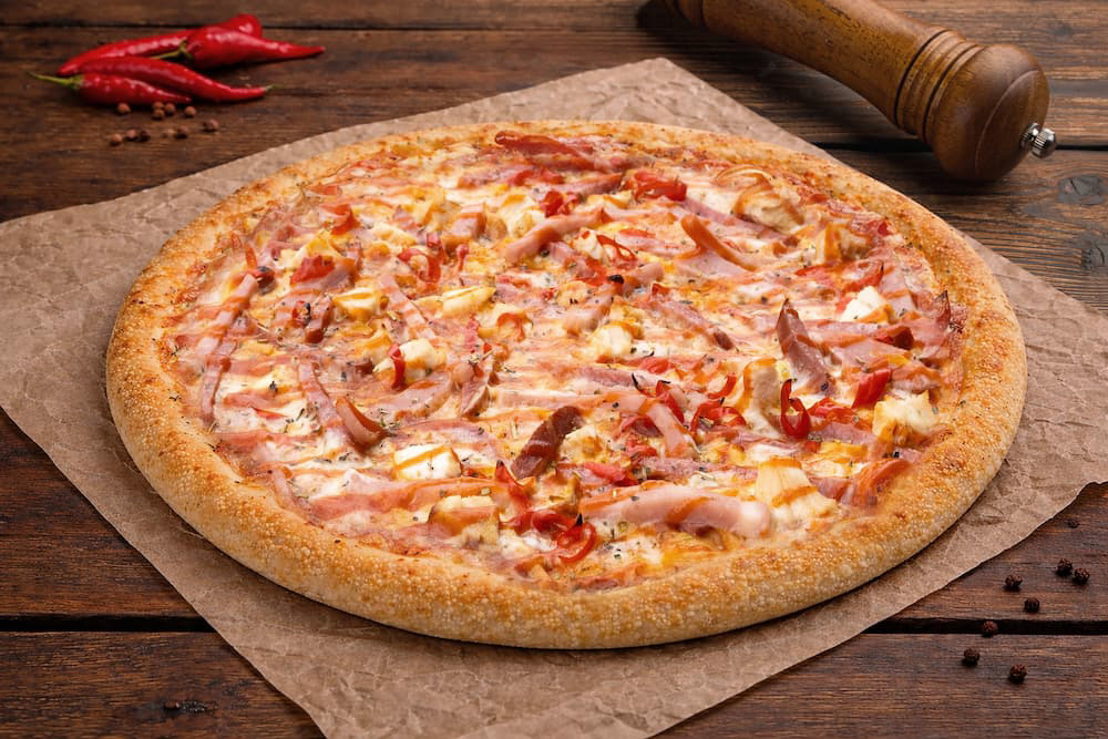 Острая пицца с копчёной курицей, колбасой салями, ветчиной, сыром Моцарелла , перцем чили и соусом Шрирача