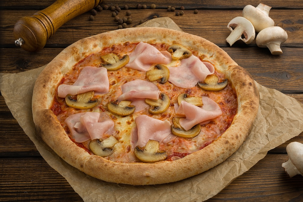 Классическая итальянская пицца на тонком тесте с томатным соусом, сыром Моцарелла , ветчиной и шампиньонами